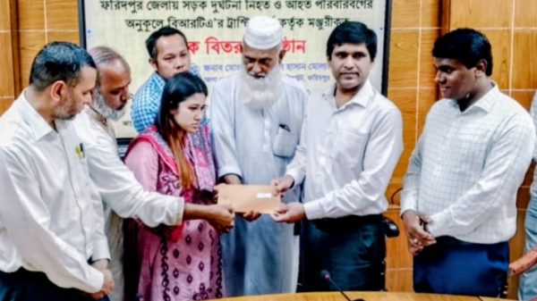 ফরিদপুর প্রতিনিধি ফরিদপুরে বাংলাদেশ সড়ক পরিবহন কর্তৃপক্ষ (বিআরটিএ) ট্রাস্টি বোর্ডের উদ্যোগে সড়ক দুর্ঘটনায় নিহত ও আহত ব্যক্তিদের পরিবারের মাঝে অনুদানের চেক বিতরণ করা হয়েছে। আজ রবিবার দুপুরে ফরিদপুর জেলা প্রশাসকের সম্মেলন কক্ষে এ চেক বিতরণ অনুষ্ঠান অনুষ্ঠিত হয়। এতে সভাপতিত্ব করেন ফরিদপুরের জেলা প্রশাসক কামরুল হাসান মোল্লা। অনুষ্ঠানে বক্তব্য রাখেন অতিরিক্ত জেলা প্রশাসক মিন্টু বিশ্বাস,